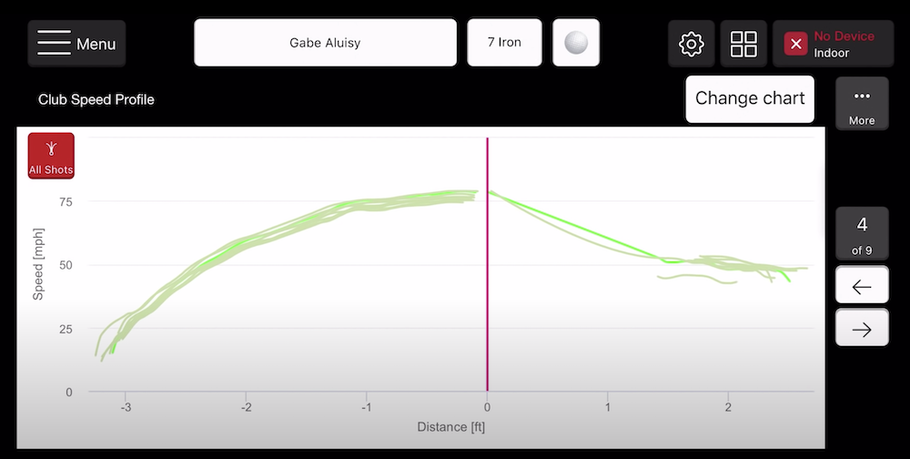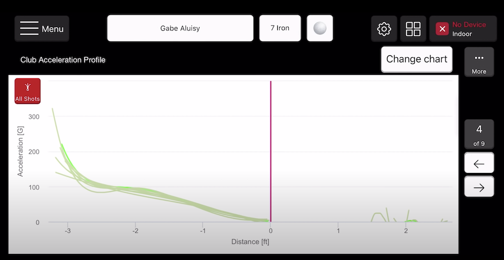 What I look for here is consistency. Others might be looking for a “J” curve at right before impact to show the shaft is giving them a bit more lift / help. Each shaft will have a different acceleration profile and by having access to this data, you’re now only limited by your ability to analyze the charts. Pretty exciting if you ask me.