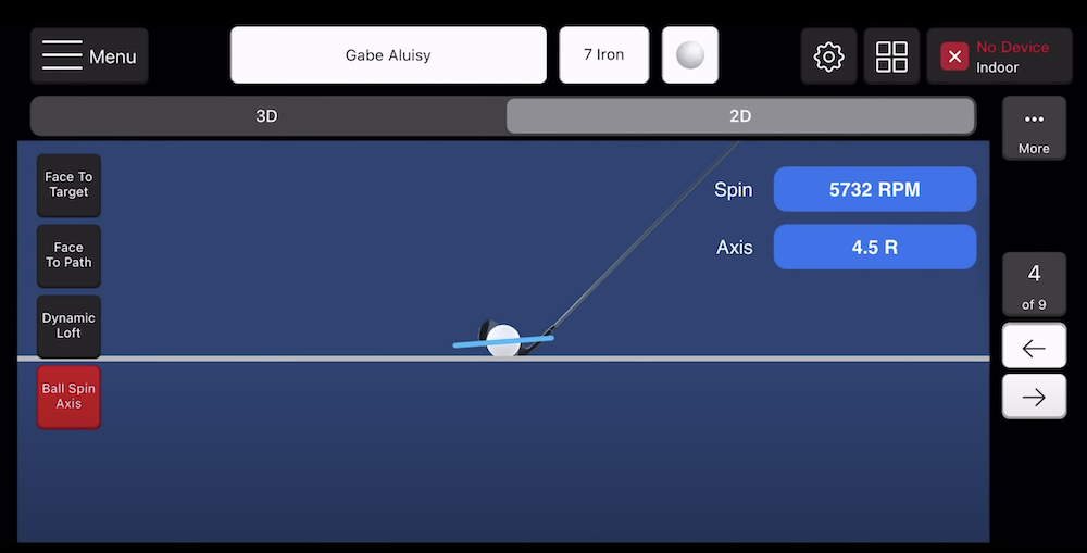 You can punch in to each of these sections individually and see more info on each aspect. I find a lot of value in the Ball Spin Axis view. It shows you at what angle the spin on the ball takes. You actually see the ball spinning in the animation the Mevo+ builds. A big blue line gives you a sense of the right or left spin that was imparted to the strike.